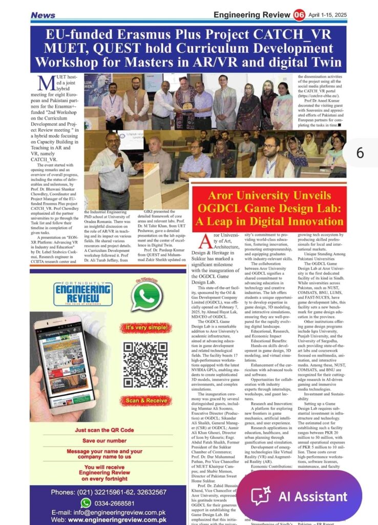Article publication in Engineering Review Magazine: The EU-funded Erasmus Plus Project CATCH_VR, in collaboration with MUET and QUEST, successfully held a workshop focusing on curriculum development for Masters in AR/VR and Digital Twin technologies. This event highlighted the significance of immersive technologies in shaping the future of education. Read more