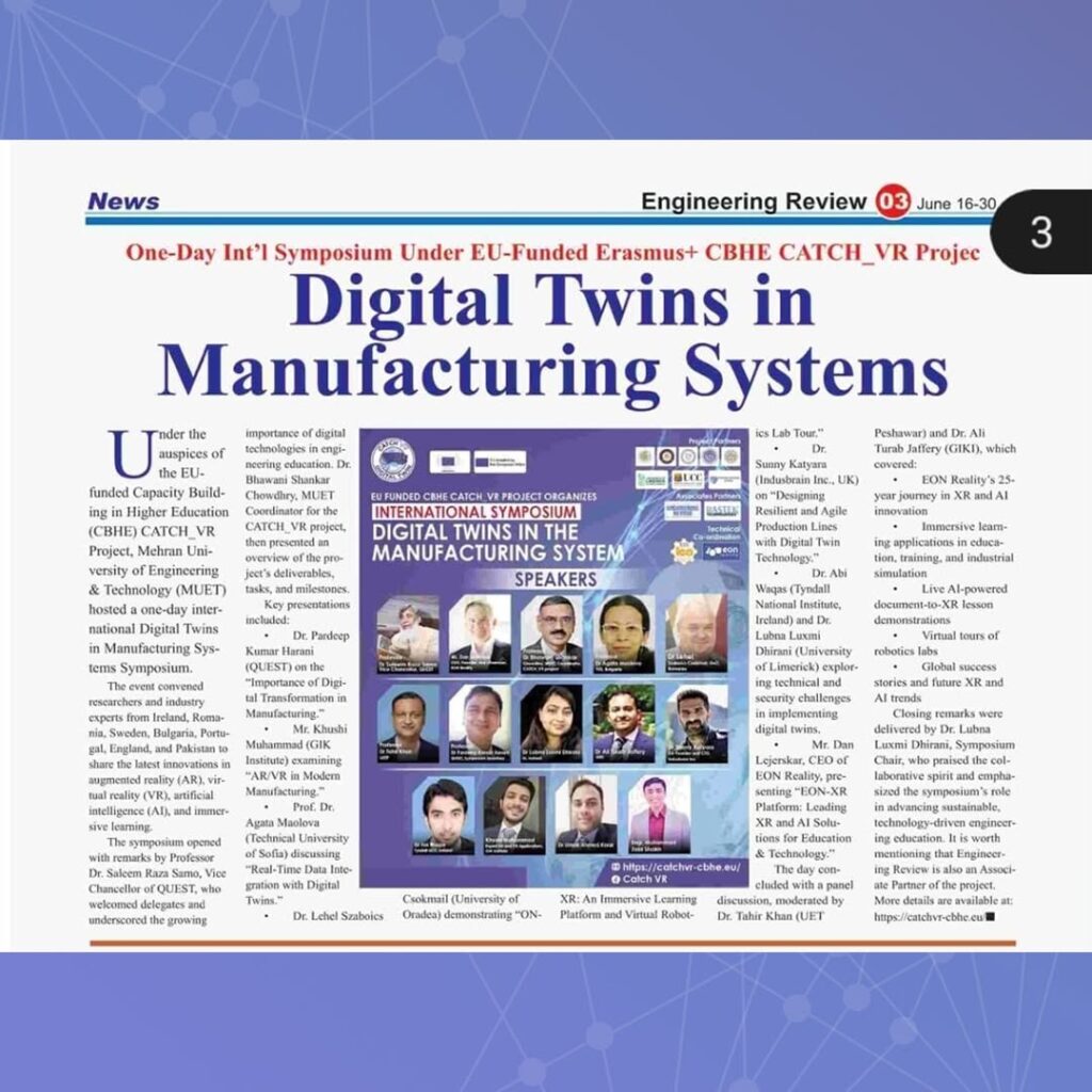 The EU-funded CATCH_VR Project, in collaboration with MUET, hosted an international symposium on Digital Twins in Manufacturing Systems. The event featured speakers from GIKI, QUEST, EON Reality, and other global institutions, highlighting AR/VR and AI in engineering education.