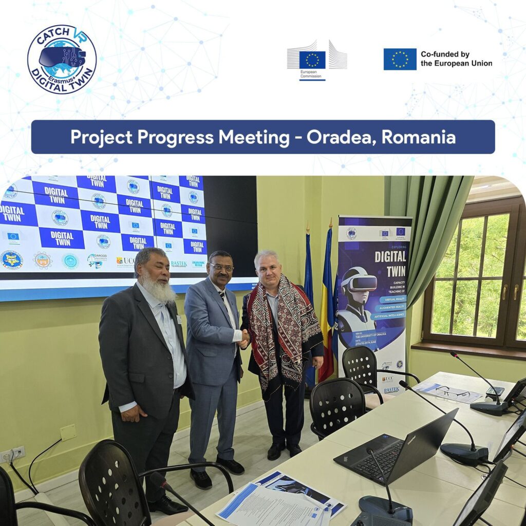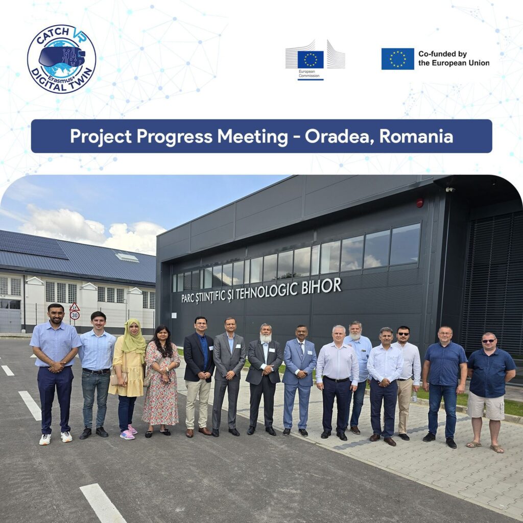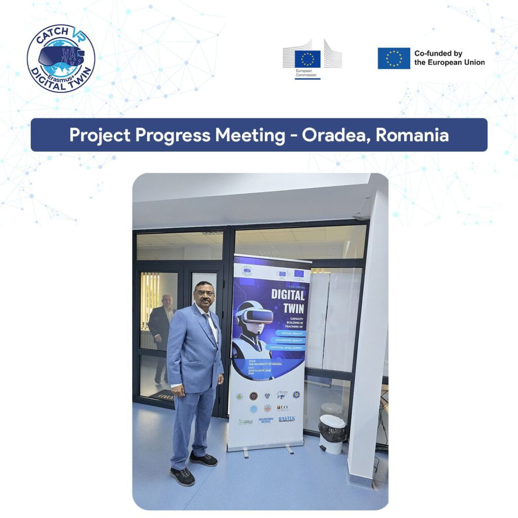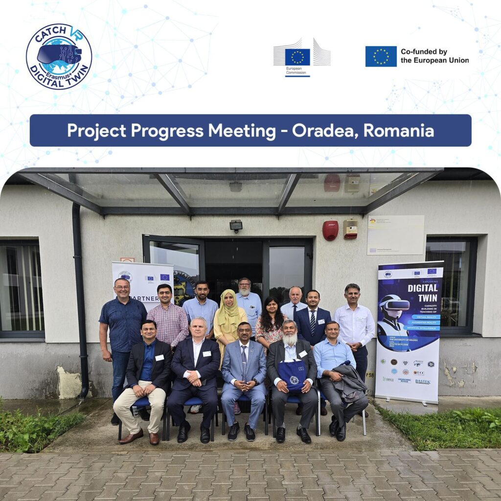 The meeting began with a warm welcome note from Prof Radu Tarca, Principal Coordinator of the CATCH_VR project at the University of Oradea, Romania. An address by Prof Sanda Monica Filip, Pro-Rector of Research at the University of Oradea followed this. In his appreciating note, Prof Dr. Bhawani Shankar Chowdhry, Project Coordinator, thanked the University of Oradea for hosting the four-day event and highlighted the significance of the CATCH_VR project and the agenda for the project progress meeting. The aim of the “CApacity building in TeaCHing of AR/VR (CATCH_VR)” project is to enhance the capacity of higher education institutions through Augmented Reality (AR) and Virtual Reality (VR) using Digital Twining with a consortium of several educational institutions from Europe and Asia focusing on Graduate Engineering Education. The project involves a participatory learning approach, with a strong emphasis on practical demonstrations and hands-on experience with physical equipment and digital twins, which promises to be an exciting and engaging part of the project. The meeting also reviewed working on various committees for the work packages and user requirement analysis and finalizing the deliverables D1.1, D6.7, and D6.9. There has been a detailed discussion on Curriculum Development. The training workshop focused on the latest trends in AR/VR technologies, leading towards Digital Twin.