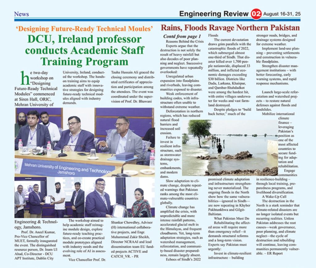 A two-day workshop on “Designing Future-Ready Technical Modules” was conducted at Siren Hall, ORIC, Mehran University of Engineering & Technology, Jamshoro. Prof. Dr. Ansel Kumar, Pro-Vice Chancellor of MUET, inaugurated the event. The resource person, Dr. Imam Ul Haq from Dublin City University, guided academic staff on innovative teaching strategies, future-ready modules, and the integration of AI in assessments. The program concluded with certificate distribution by Tauha Hussain Ali, Vice Chancellor MUET.